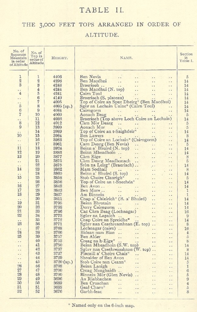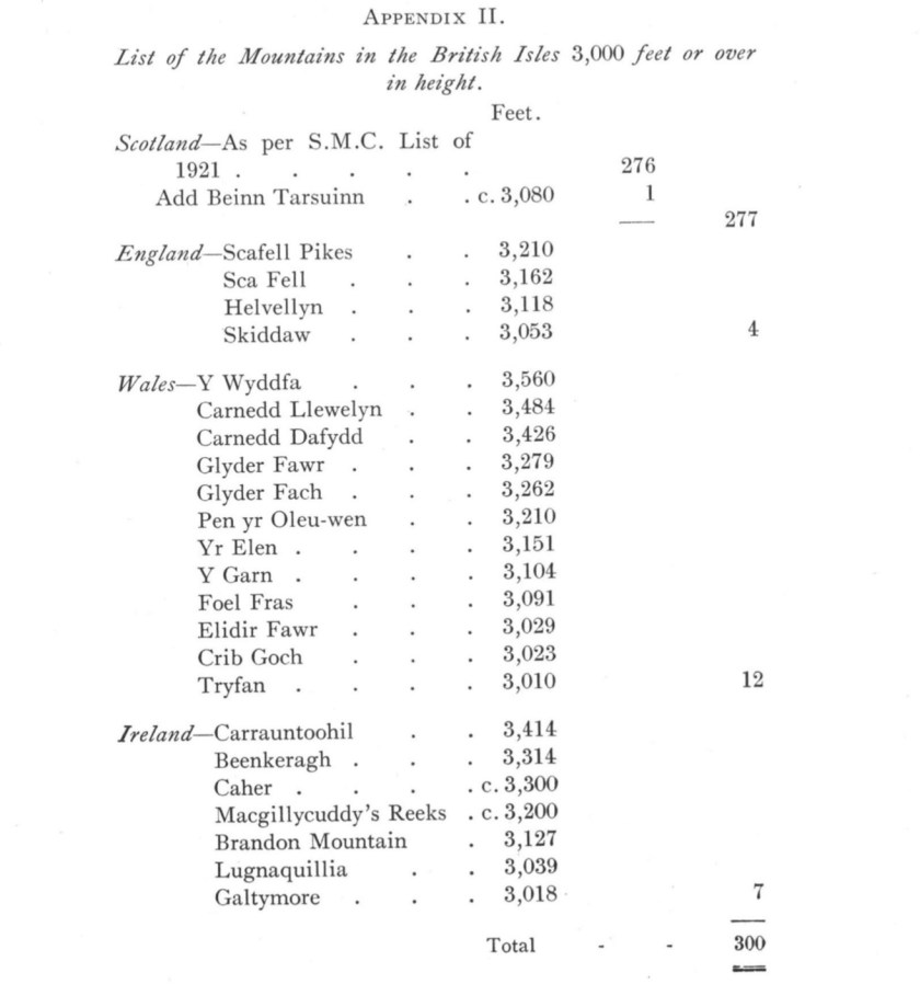 In 1954 Docharty published a list of all the hills between 2,500ft and 3,000ft in Great Britain. His list, titled ‘A Selection of some 900 British and Irish Mountain Tops’ was privately published and still remains relatively obscure even to this day. The list was subclassified into ‘Independent Mountains’ and ‘Tops’ and also included a list of the 3,000ft hills in England, Wales and Ireland.