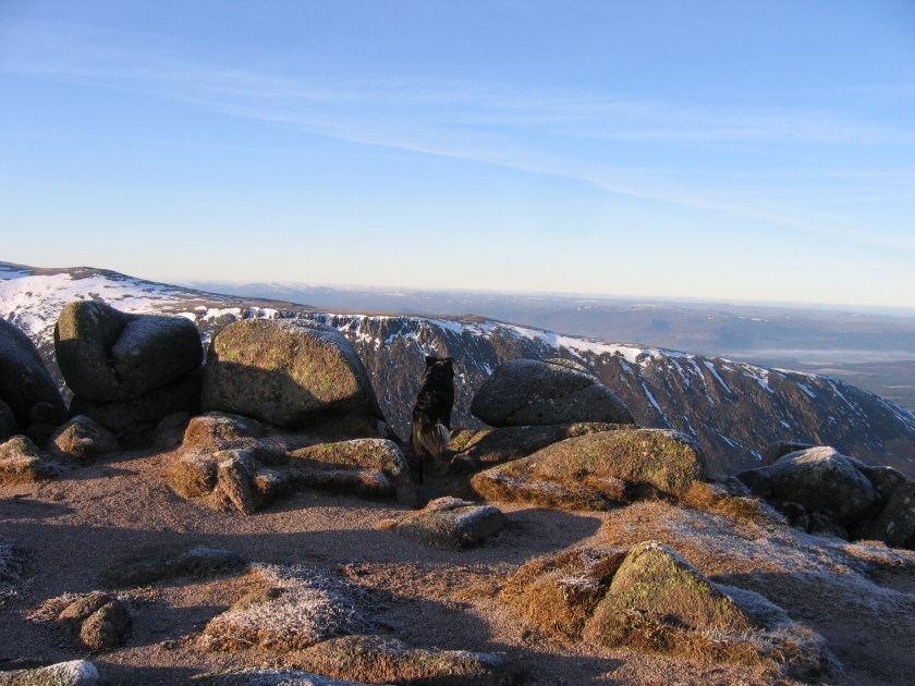 The walk through the Ryvoan Pass was somewhat chilly. On arrival at the Green Lochan Molly was disturbed to find it frozen solid and had a major sulk when she realised that a swim was out of the question.