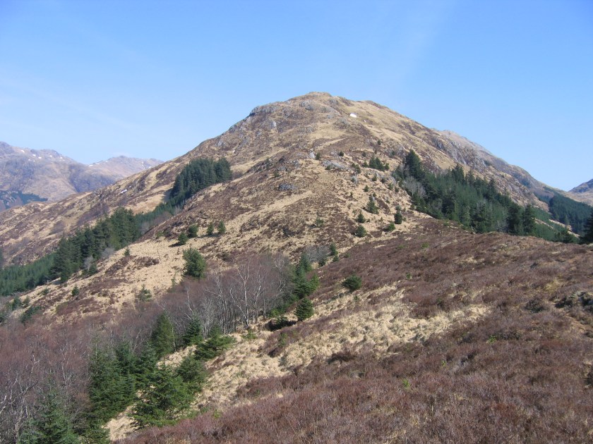 The good weather continued and after a short hop across Loch Linnhe on the Corran ferry I arrived in Glen Huirich near Kinlochan to climb my last Corbett in Ardgour. After 30 minutes along a forest track I reached the small cairn that indicated the steep route through the forest up onto the ridge.