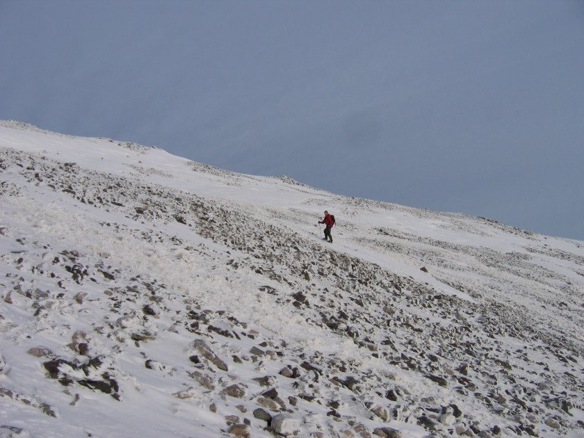 From the frozen lochans we decided to head up the band of snow to the col below the summit it was far easier to crampon up the hard snow than to slip and slide amongst the icy rocks.