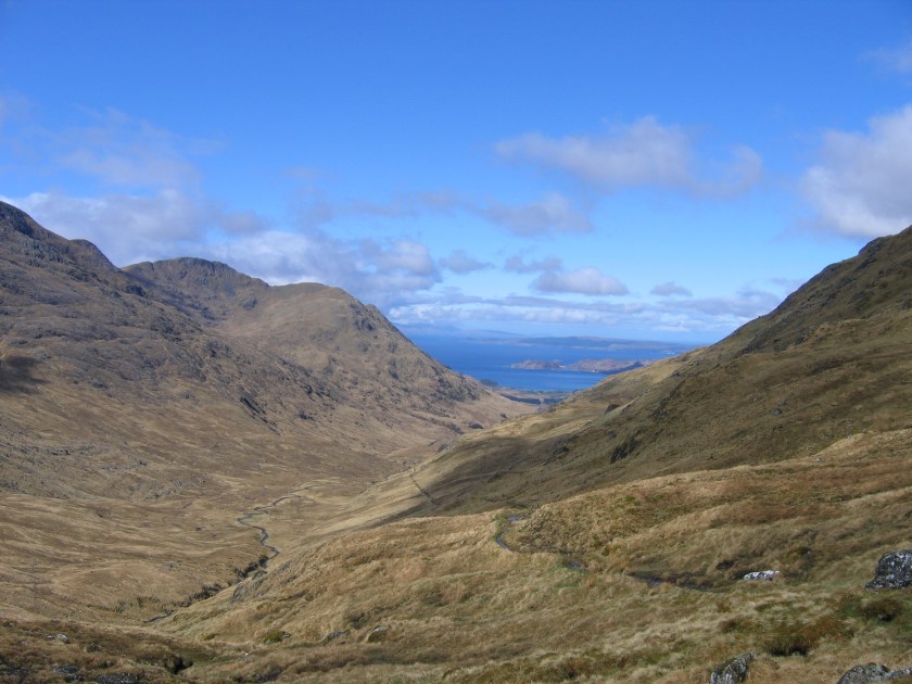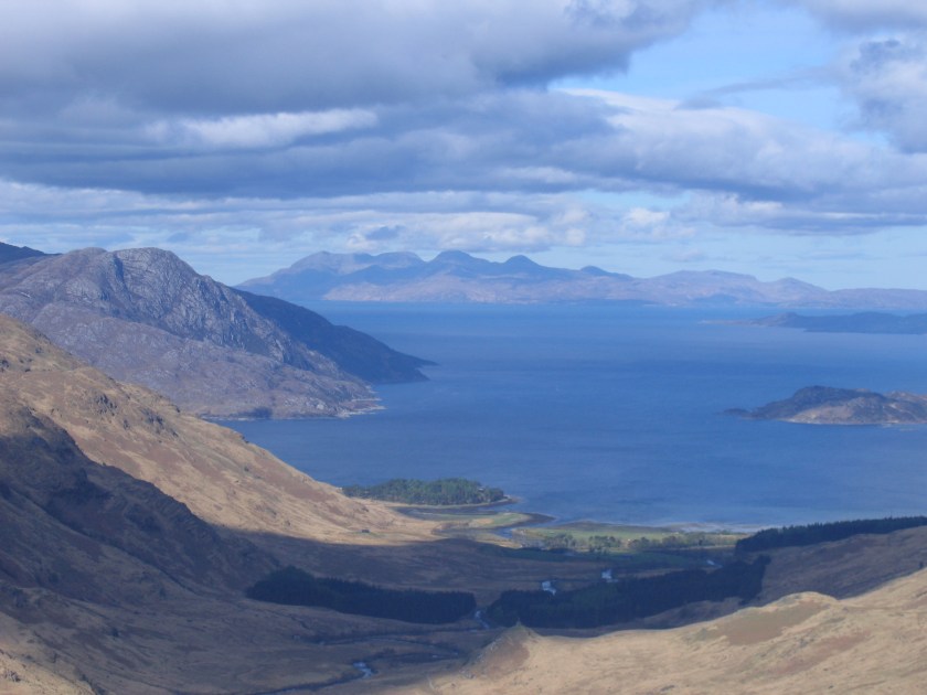 As time was no object we decided to traverse part of the Beinn Bhuidhe ridge, beginning with the long walk up the glen to the Mam Meadail. There were ever increasing views back across Inverie to Rum as we gained height and once we reached Mam Meadail the views were stunning.