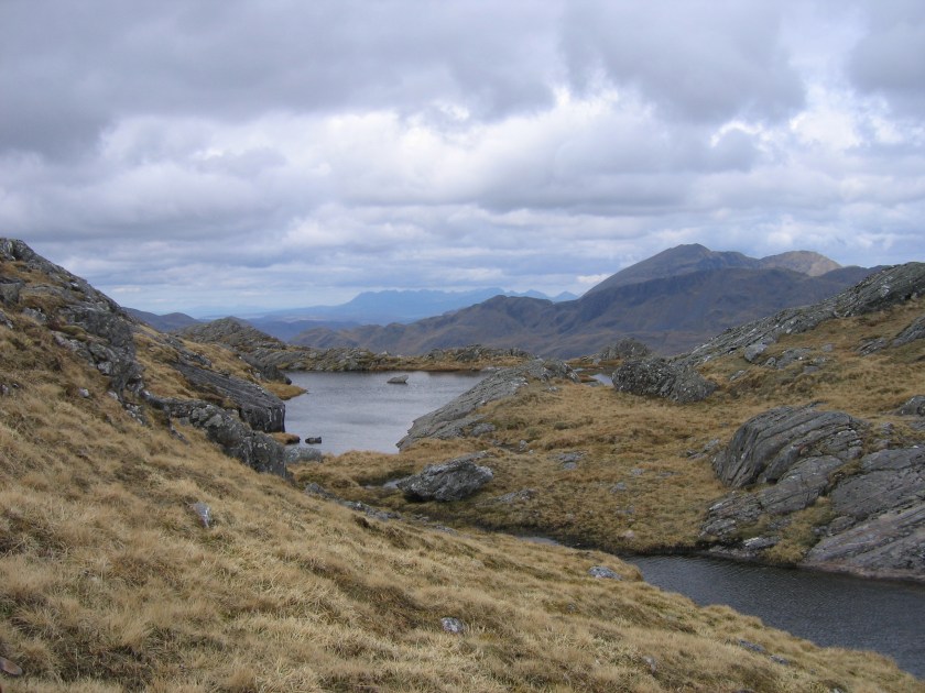 We woke to another stunner and it was even warmer than the previous day. We walked past the Brocket Memorial, continued into Gleann an Dubh-lochain and headed up the steep tussocky slopes to the Mam Suidheig at a height of 490m. At several points during the climb I felt like I was going to expire as it was HOT, HOT, HOT, a weather phenomenon I am not accustomed to living in the north of Scotland. Thankfully once we reached the bealach there was a decent breeze which kept going all day.