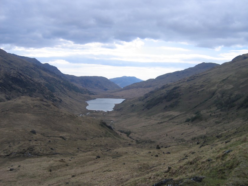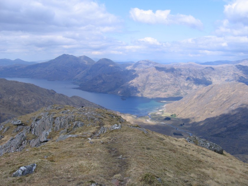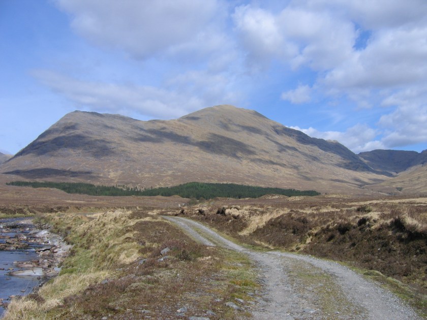 The day dawned bright and sunny so we decided to tackle our longest day and I particularly wanted good visibility to tackle the ridge between the two Munro’s. We started up the now familiar track along Gleann Meadail and annoyingly the best views were behind us.