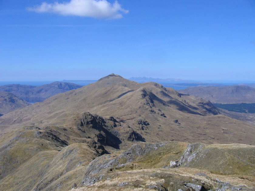 We climbed up through the forest behind the pier, followed the track to the Mam Uidhe and then straight up the steep grassy hillside to the flat area above the Slochd a’ Mhogha gorge. As soon as we reached the foot of the SW ridge a motorway style path appeared which we followed to the summit.