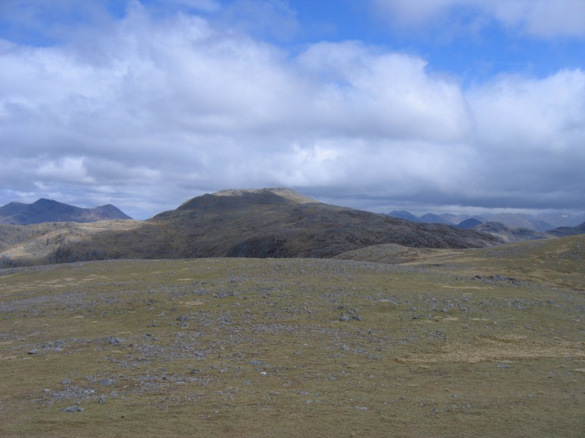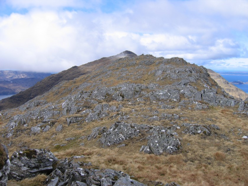 We continued to the SE top and then picked up the well worn path along the ridge to Luinne Bheinn. The views into Coire Odhair were exceptional and a whole new experience to me having seen nothing on my previous visit. All my worries about navigational difficulties were unnecessary as the path continued all the way to the summit of Luinne Bheinn…………………….thank God for Munro baggers!