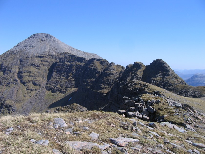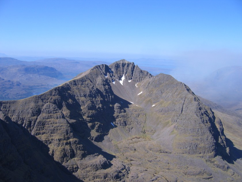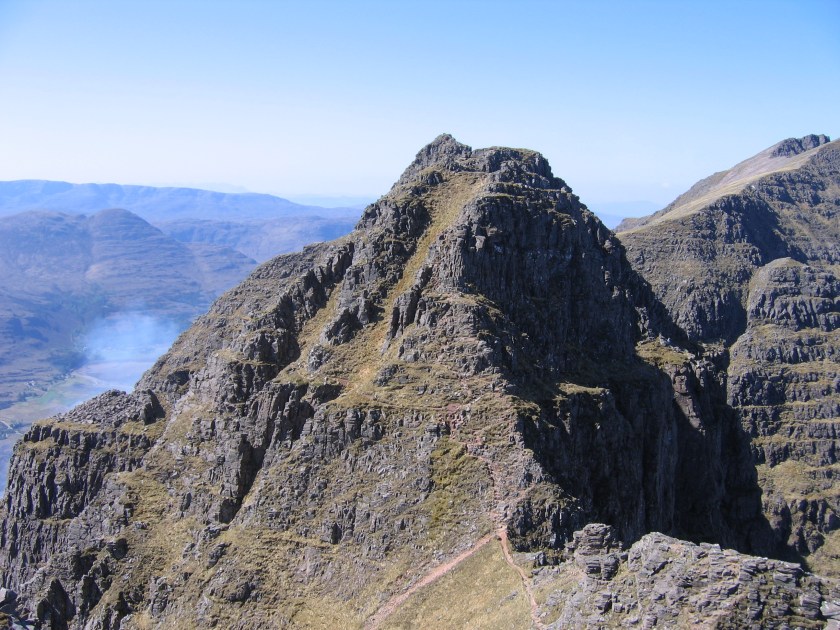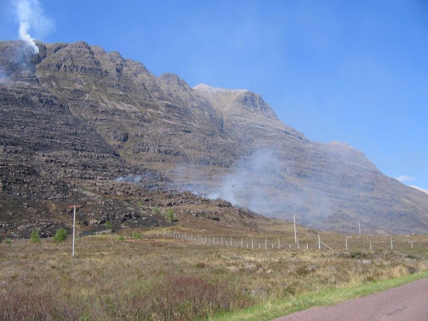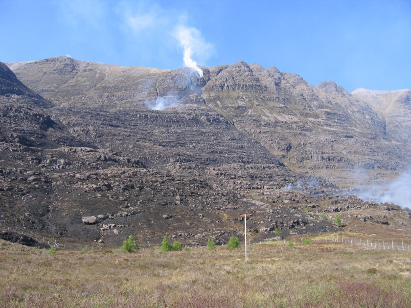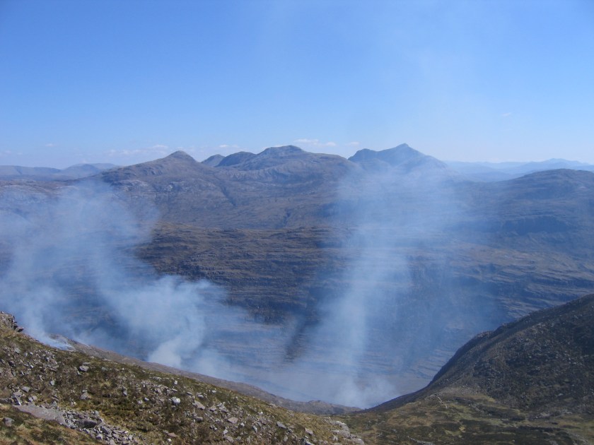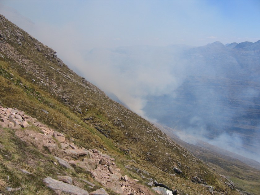 An area of high pressure was fixed over the west of Scotland so we decided to go to Torridon. When we arrived in the lay-by at the foot of Liathach we noticed a small patch of smoke further down the glen which we assumed was some late muirburning. It was a stunning morning, very warm and it was a steep slog up the ‘path’ in Coire Liath Mhor, eventually reaching the ridge after 2 hours.