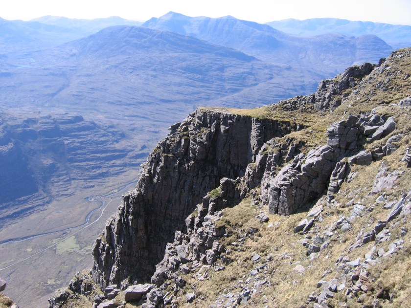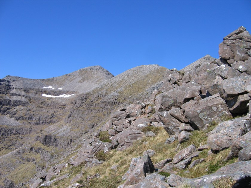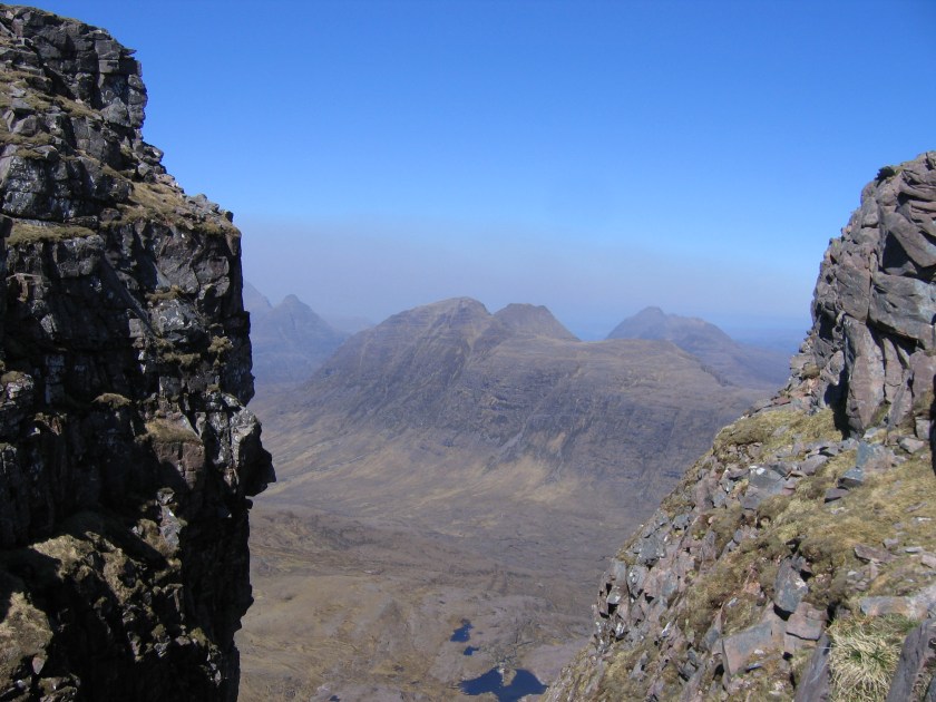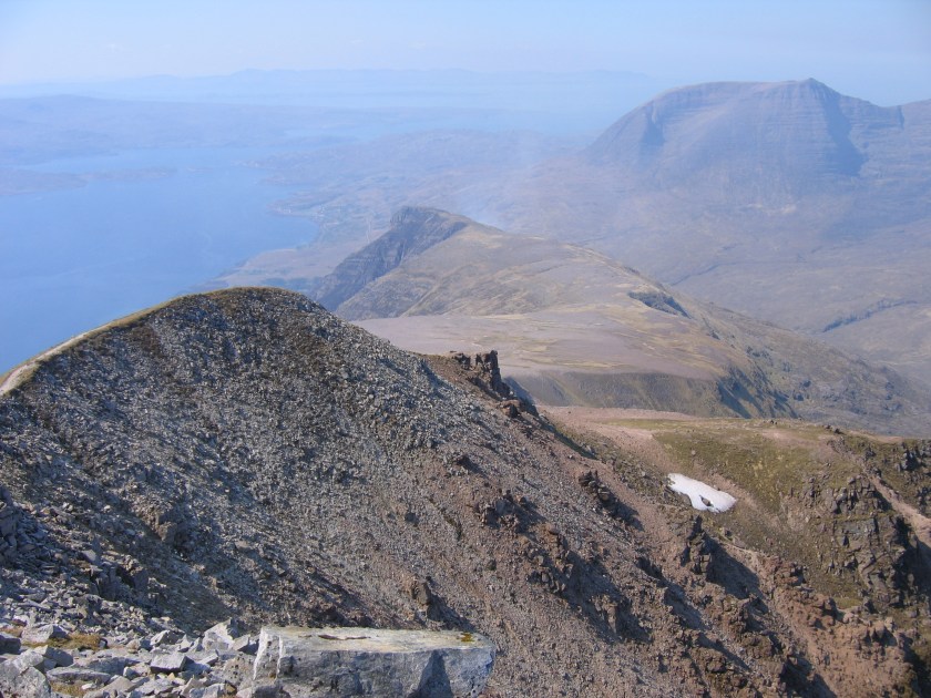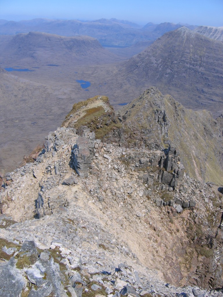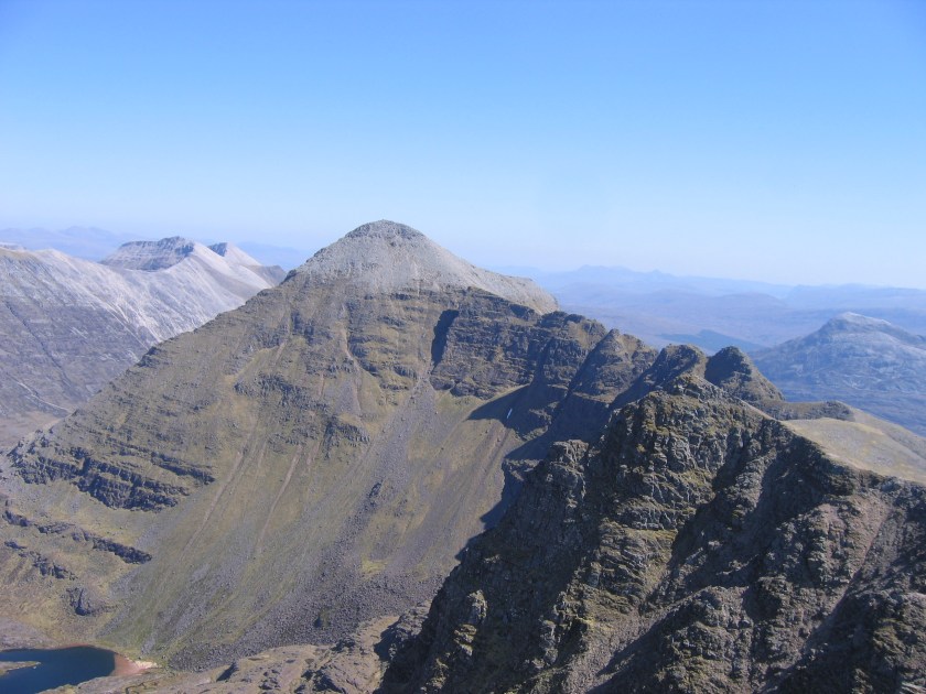 An area of high pressure was fixed over the west of Scotland so we decided to go to Torridon. When we arrived in the lay-by at the foot of Liathach we noticed a small patch of smoke further down the glen which we assumed was some late muirburning. It was a stunning morning, very warm and it was a steep slog up the ‘path’ in Coire Liath Mhor, eventually reaching the ridge after 2 hours.