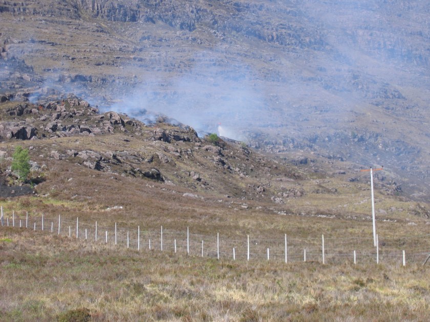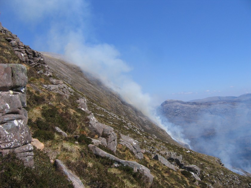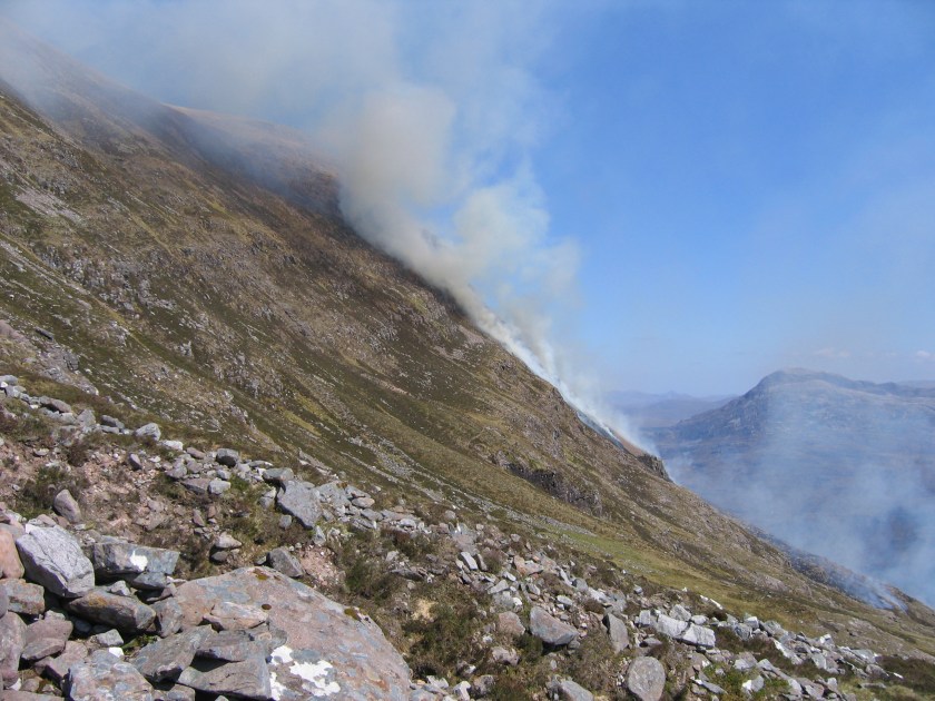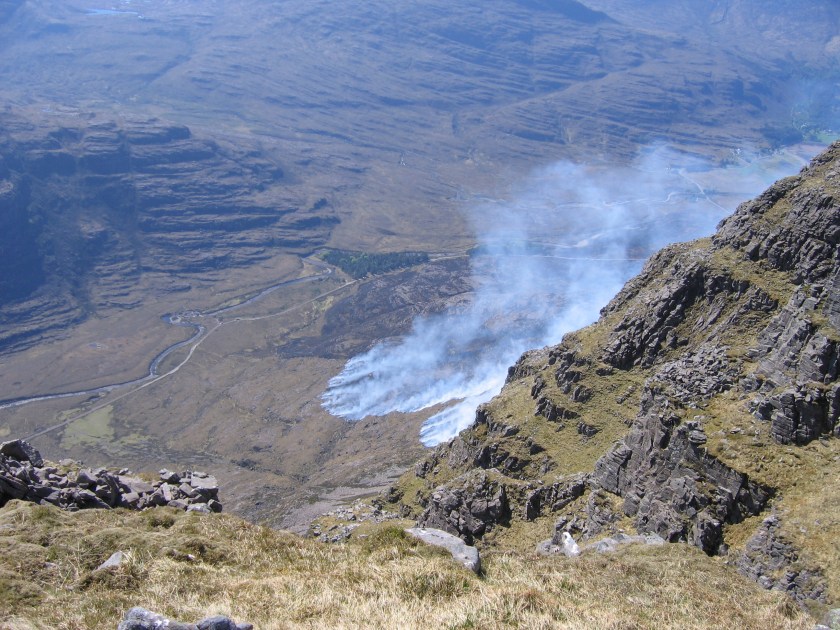As we traversed the grassy ridge to Mullach an Rathain, we were becoming more aware of smoke in the air and we got our first view of the fire smoldering away below us.