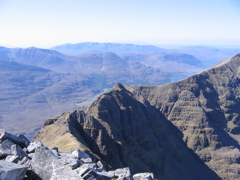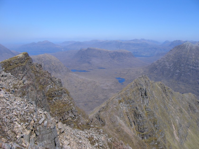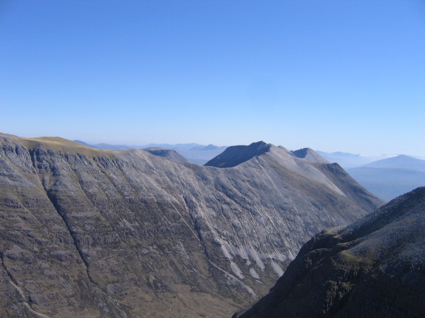 Looking towards the west we couldn’t see any signs of smoke, just a bit of a haze in the glen between Liathach and Beinn Alligin and spectacular views along the ridge over the Munro Top, Am Fasarinen to Mullach an Rathain and Coire na Caim.