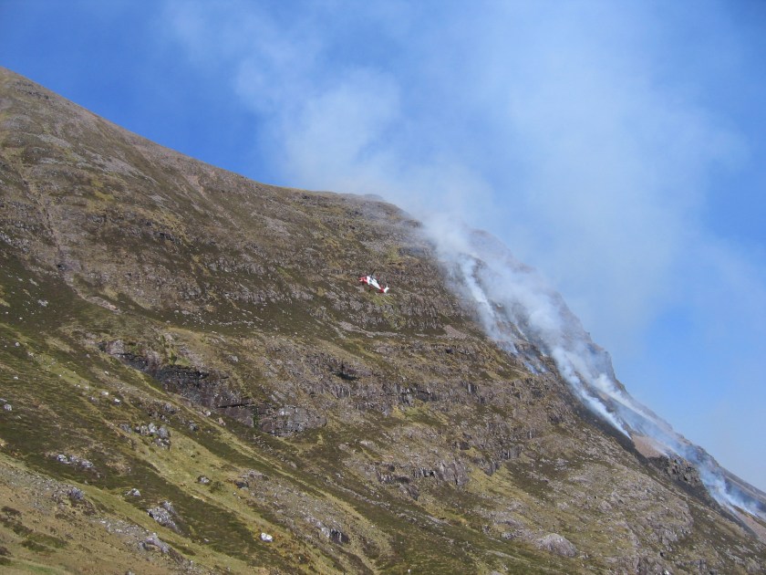 The winchman explained, that although the fire was moving away from us, we wouldn’t be able to continue our descent through the corrie as the fire brigade wanted to start water bombing the fire front, we were in their way and they were not allowed to fly over us…………….health and safety rules apparently. For a minute I thought we would have to walk back up and descend by another route but our rescuer had other ideas and told us that they would give us a lift back to Torridon village. Result!