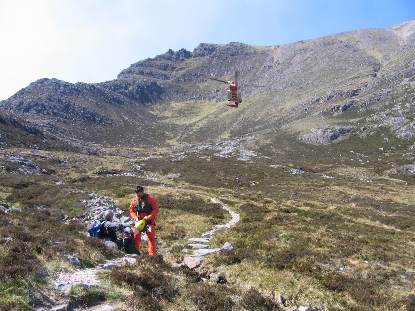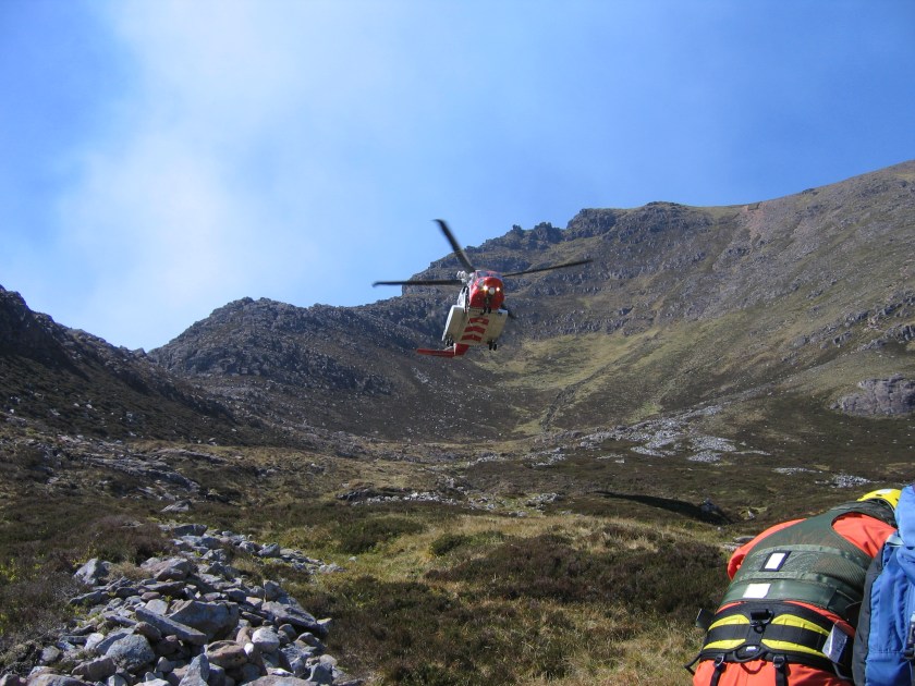 As we were chatting away a HMCG helicopter came in to view and flew over the fire and round the corrie a couple of times. We sat down to watch what was going on and the helicopter slowly descended behind us and a man jumped out.