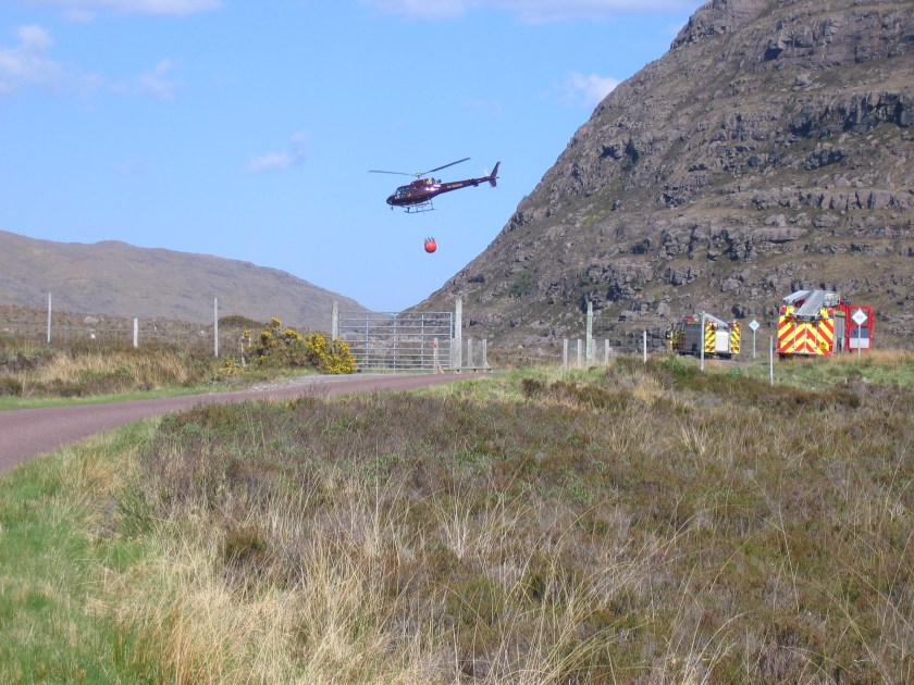 As we rounded the corner we saw the smaller helicopter in action water bombing the fire. The water was being gathered from the river and dumped on the hillside, each dump taking less than a minute and it was incredible how quickly the flames and smoke had decreased in the time we had walked up the glen.