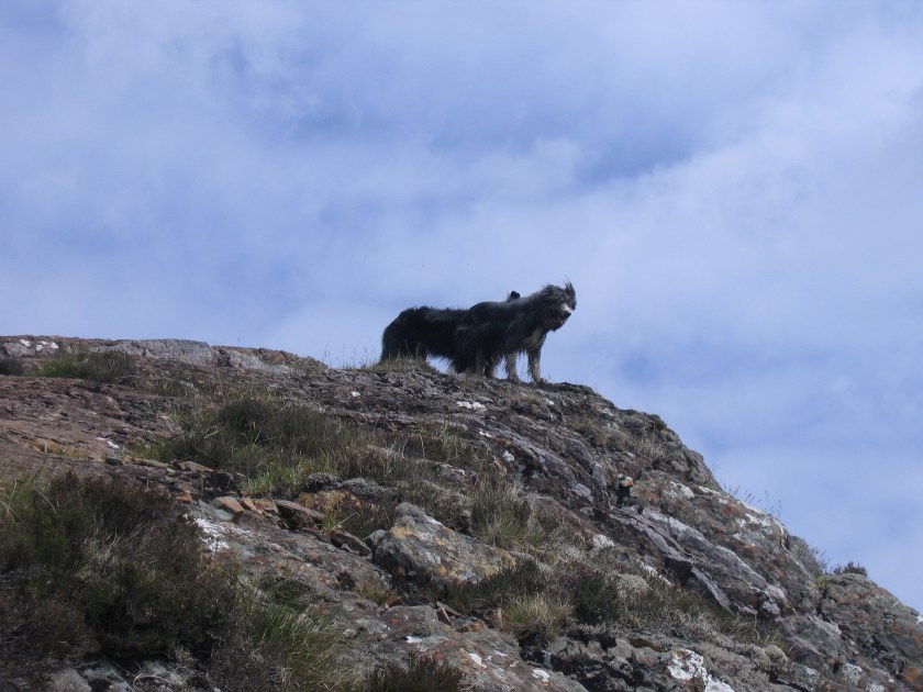 We climbed steeply out of the back of the corrie to emerge at the lochans which provided a welcome spot for lunch and some doggie dunking.