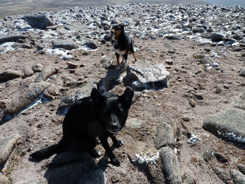 We met a couple with two dogs at the summit and all hell broke loose as four dogs played a game of chase round the summit cairn enjoying the wind in their tails. It was bitterly cold so we quickly dragged Molly and Meggie away from their new found friends to make our way into the shelter of the glen as quickly as possible. We made a rapid descent to the path in the Lairig an Laoigh passing a huge herd of red deer basking in the sunshine on the slopes.