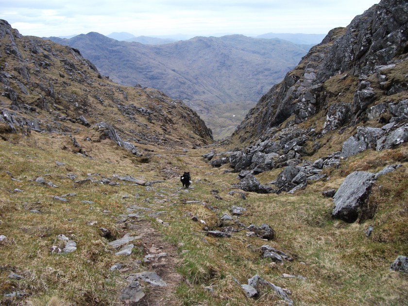The views were as stunning as l remembered them and l always find it highly enjoyable to share a summit with someone who is experiencing the landscape for the first time. After a while the reality of our situation dawned on us, we were a very, very long way from our ultimate destinations so it was with great reluctance that we dragged ourselves away and retraced our steps down to the col followed by the boulder hop down the pass of Feadan na Ciche.