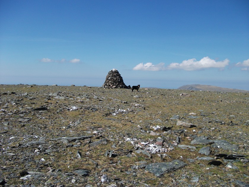 It was a pleasure to walk in the cool evening air. The light was mesmerising and the cloud effects looking back to A’ Mhaighdean were a boost for our tired legs, we lingered at the summit and Molly enjoyed a snooze.