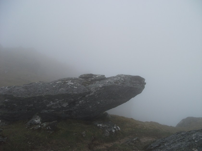 We returned to the bealach and then walked through the rocks to the grassy slopes of A’ Mhaighdean where visibility was less than 10m.