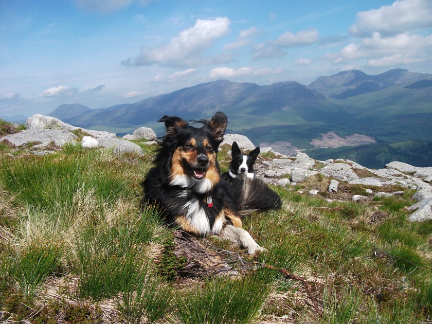 On previous visits to these hills the approach routes have always been a boggy slog through an endless squelchy mess before reaching some more solid terrain on the ridges. Today I was pleasantly surprised to find the paths soft and dry after the relatively dry spring. The going was easy under paw and we made quick progress onto the steep north ridge where the views got better and better, even Molly and Milly seemed to be stopping to take it all in rather than dashing around the hillside as per usual.