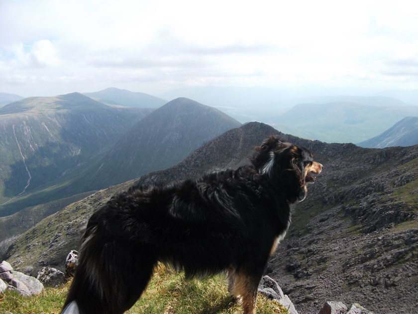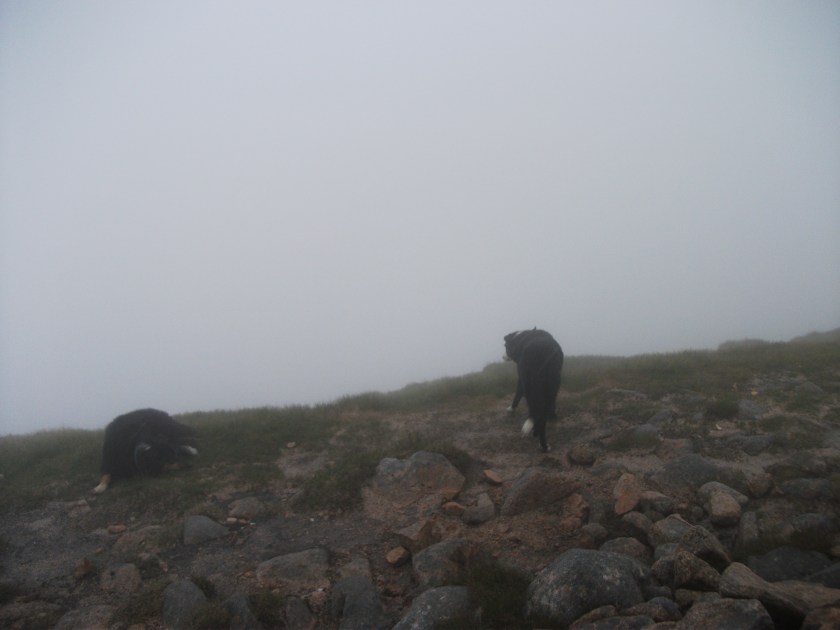 We turned round and started to retrace our steps back to the col and within a couple of minutes the first spots of rain hit us, it got heavier and heavier, so I succumbed and stopped to put on my waterproofs. By the time I had redressed the cloud was beginning to cover the summit of Ben Starav and slowly but surely Ghlas Bheinn Mhor was disappearing under a blanket of cloud and the rain begun to turn into that ‘set in for the rest of the day’ type rain. As l reached the Starav/Ghlas Bheinn Mhor col the wind and the rain seemed to veer and hit us head on so it was just a case of head down up to the summit. Even Molly and Milly seemed a bit despondent; ears back and tails down, they seemed as keen as I was to get this over with as quickly as possible.