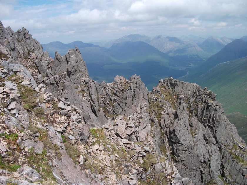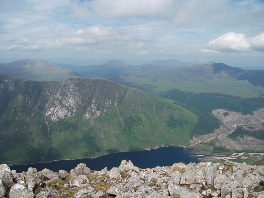 We rewarded ourselves with a leisurely break at the summit, then carried on down the rocky ridge to the bealach below Beinn nan Aighenan, still enjoying the views with Ben Cruachan looking particularly prominent.