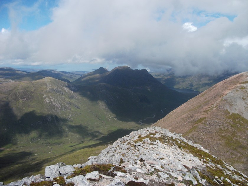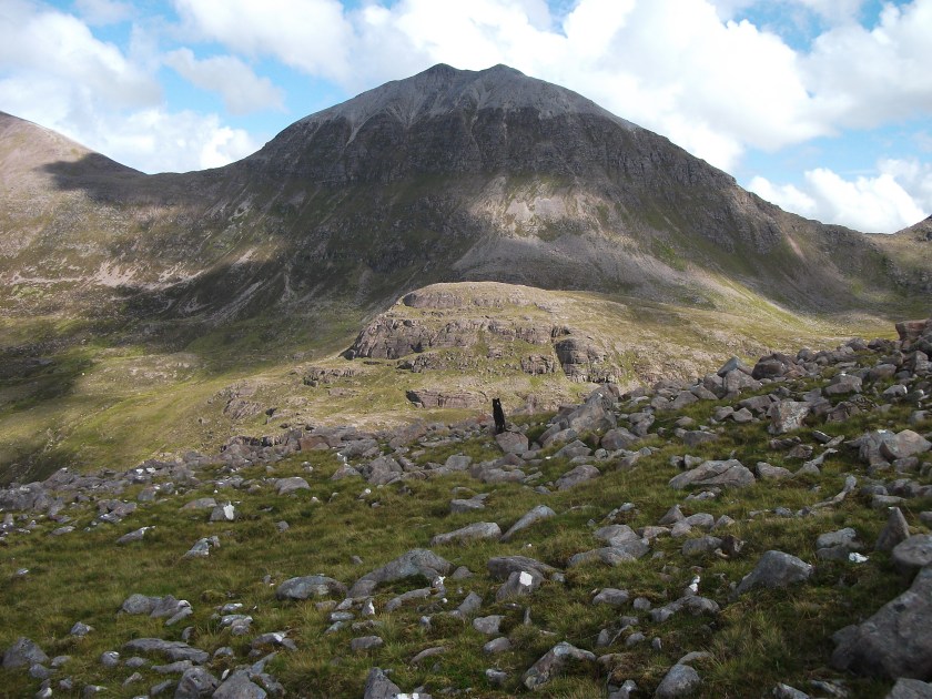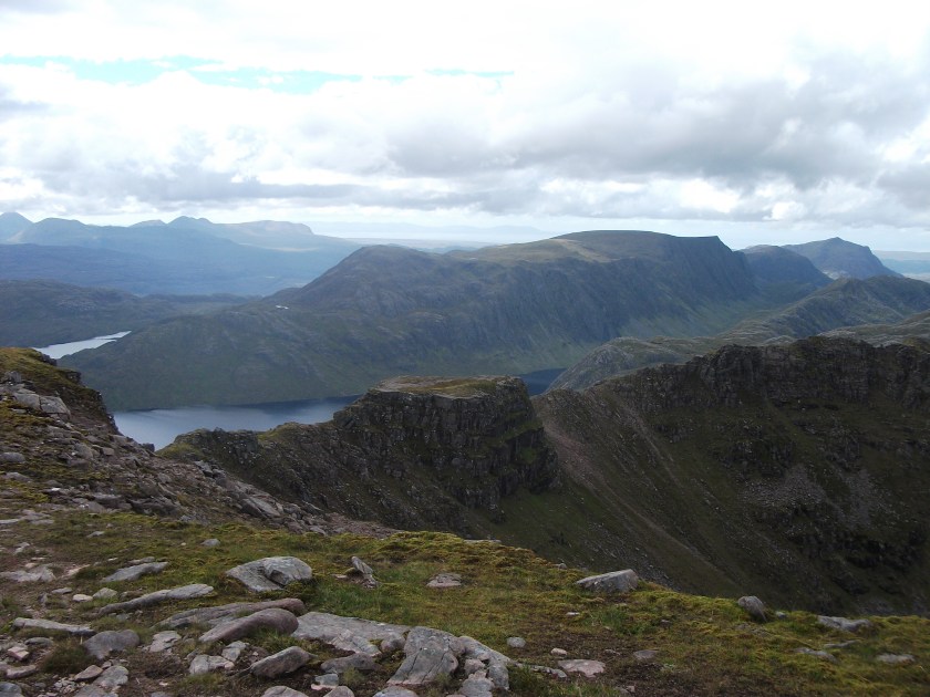 The rest of the day’s route was laid out in front of us, flecks of cloud capped some of the Fannaichs and Torridon hills but the views along the coast and across to An Teallach were clear. The only major cloud on the horizon was the anticipation of the climb up through the boulderfield on Sgurr Ban, at least the rocks were dry and we had good visibility, but this did also mean we could see exactly how far we still had to go!