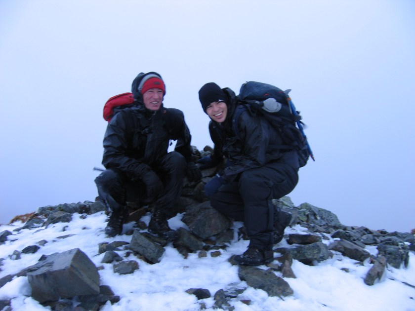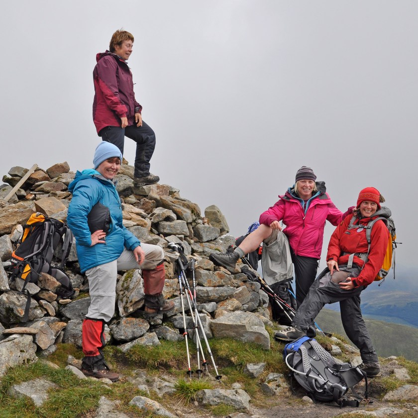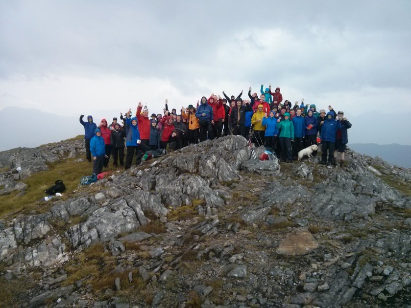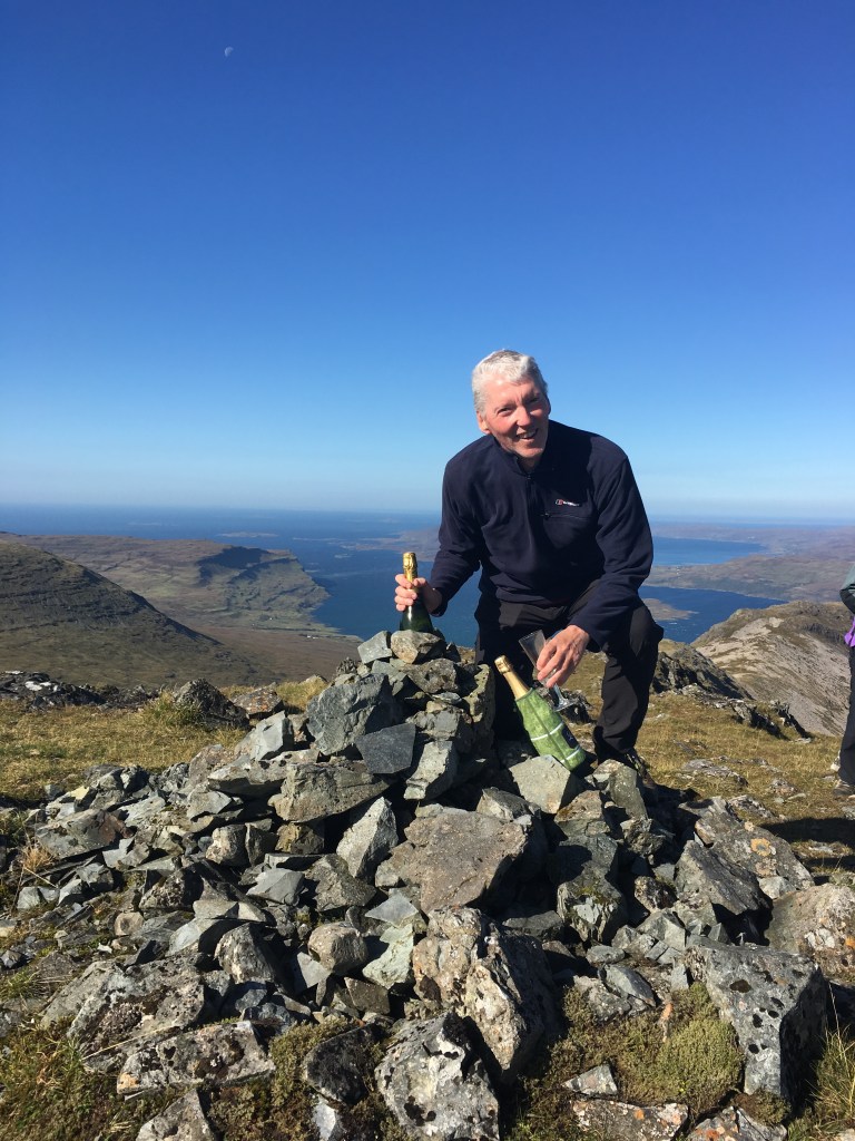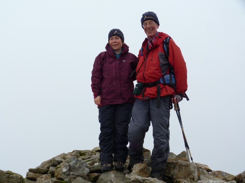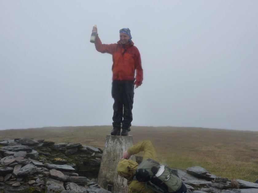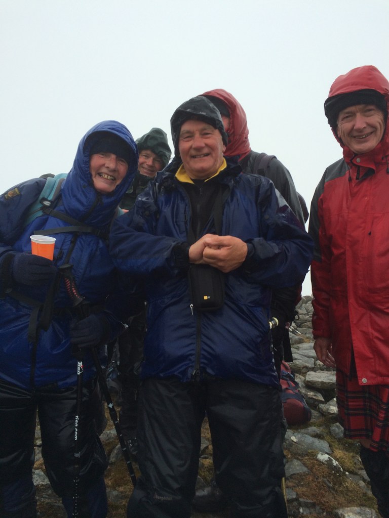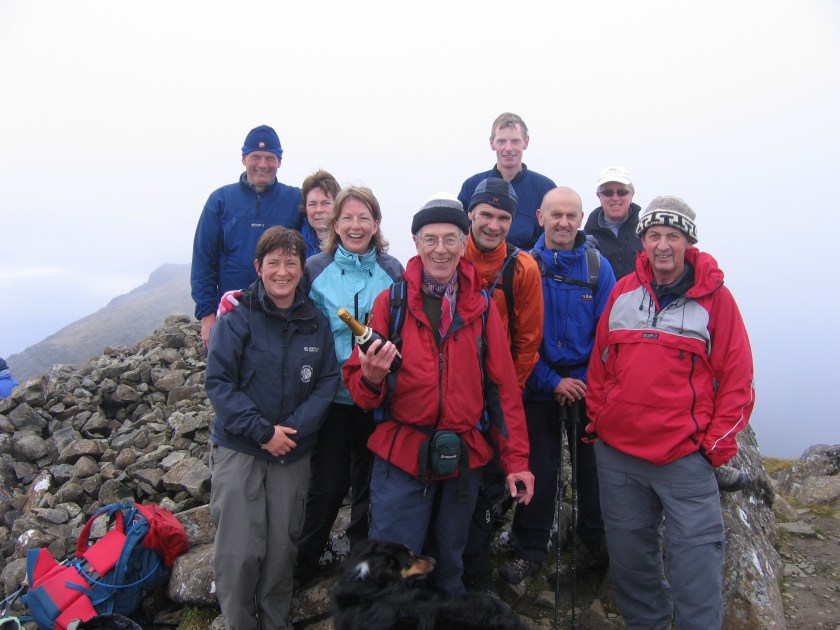 It was warm and damp when we left Mamore Lodge with low cloud obscuring the views. The climb up went quickly and then it was champagne corks popping and photos. I don’t remember any extreme emotions, just being happy walking with friends and family.