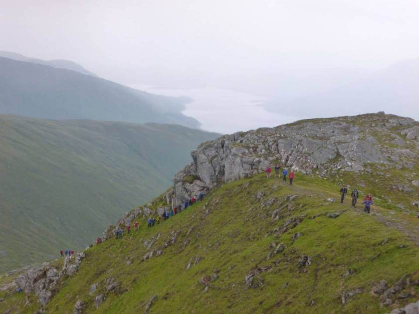 From the North Face carpark the group became strung out on the long slog up Carn Mor Dearg where the weather closed in and people disappeared into the mist along the arete not to be seen again until the summit. A lot of bemused onlookers joined the completion party at the summit of Ben Nevis, most without a clue what was going on but hoping to be invited to join in.