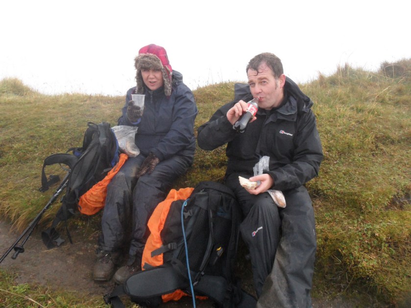 The rain was diluting the summit champagne very quickly so we didn’t hang about for long. It was a speedy descent, people were cold and shivering, we leapt over the barbed wire, beyond caring if we tore our sodden waterproofs, we negotiated the lochan sized quagmire of cow shit and arrived soaked and dishevelled back at the car park with just the small matter of trying to get Molly clean between us and a warm shower at the hotel.