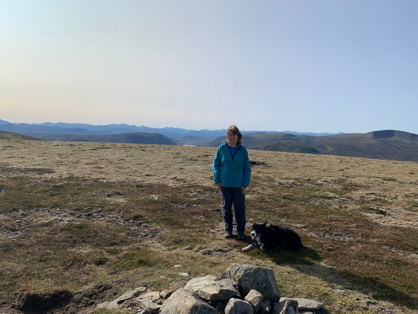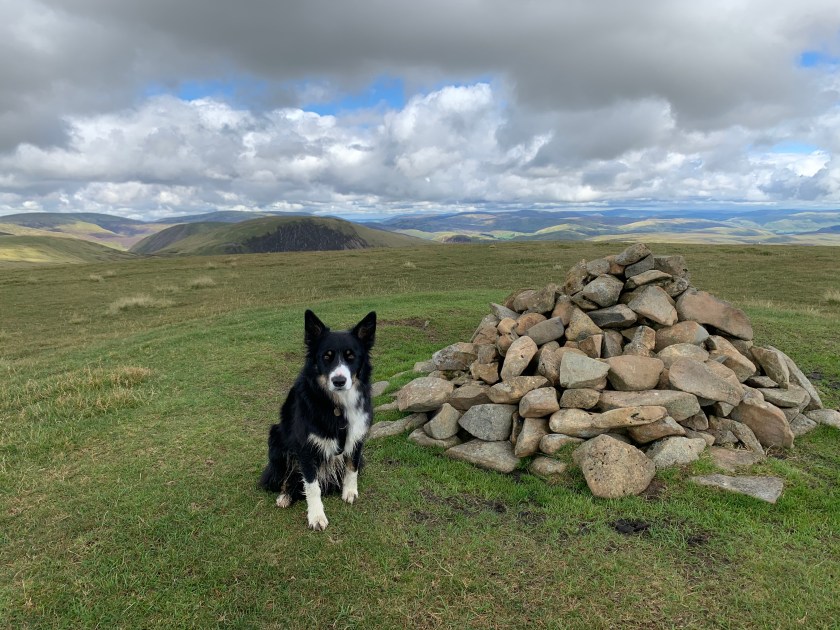 The sun came out for our trip to Loch Skeen and after a couple of lengthy diversions to visit some outlying Donald Tops which had been omitted on previous visits Ralph arrived at the summit of White Coomb, his final Donald. He posed for photographs (yes he is pleased, that is his happy face) and found a large piece of wood to carry back to the car. The visit to White Coomb was a poignant one for me being one of the few hills that I have climbed with Molly, Meg and Ralph.