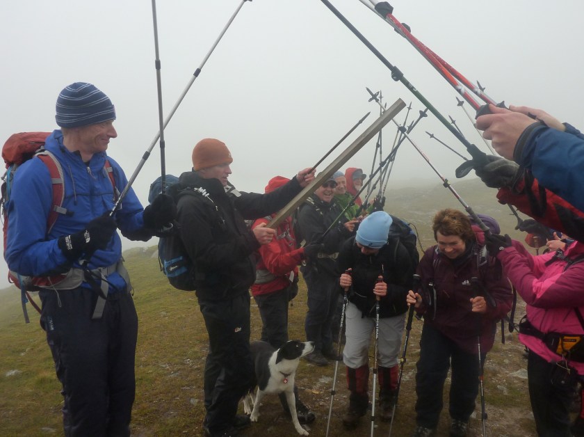 There was no sign of the very slow group on the long ridge so we presumed they were missing in action and carried on to welcome Alan to the cairn marking his final Graham.