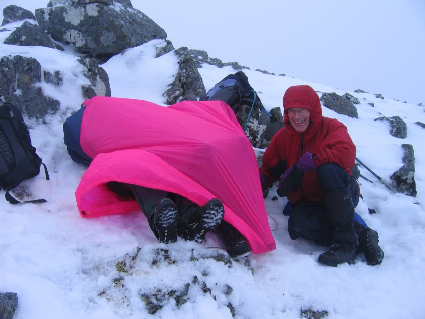 It was a long wait! At one point 4 people and a dog were taking it in turns to shelter in the bothy bag to stave off hypothermia. We couldn’t really complain because by the time the completion party arrived the champagne was properly chilled.