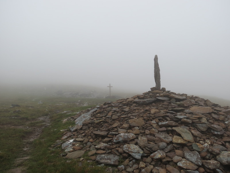 After a short section of ridge the summit appeared out of the mist, the trekking pole archway was formed and I reached the cairn.
