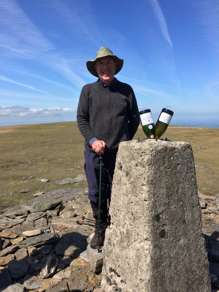 As luck would have it Alan, another friend from England, was also in Glendalough at the same time and invited us to join him on Lugnaquilla to celebrate his Furth completion. We woke to blue skies and wall to wall sunshine. This came as a bit of a shock as we had expected rather more Scottish weather! It was t-shirt and sunhat weather when we met Alan on the grassy slopes of Lugnaquilla. We celebrated Alan’s completion at the large summit cairn with screw top ‘champagne’. Luckily a local was on hand to point out what we were looking at on the horizon.